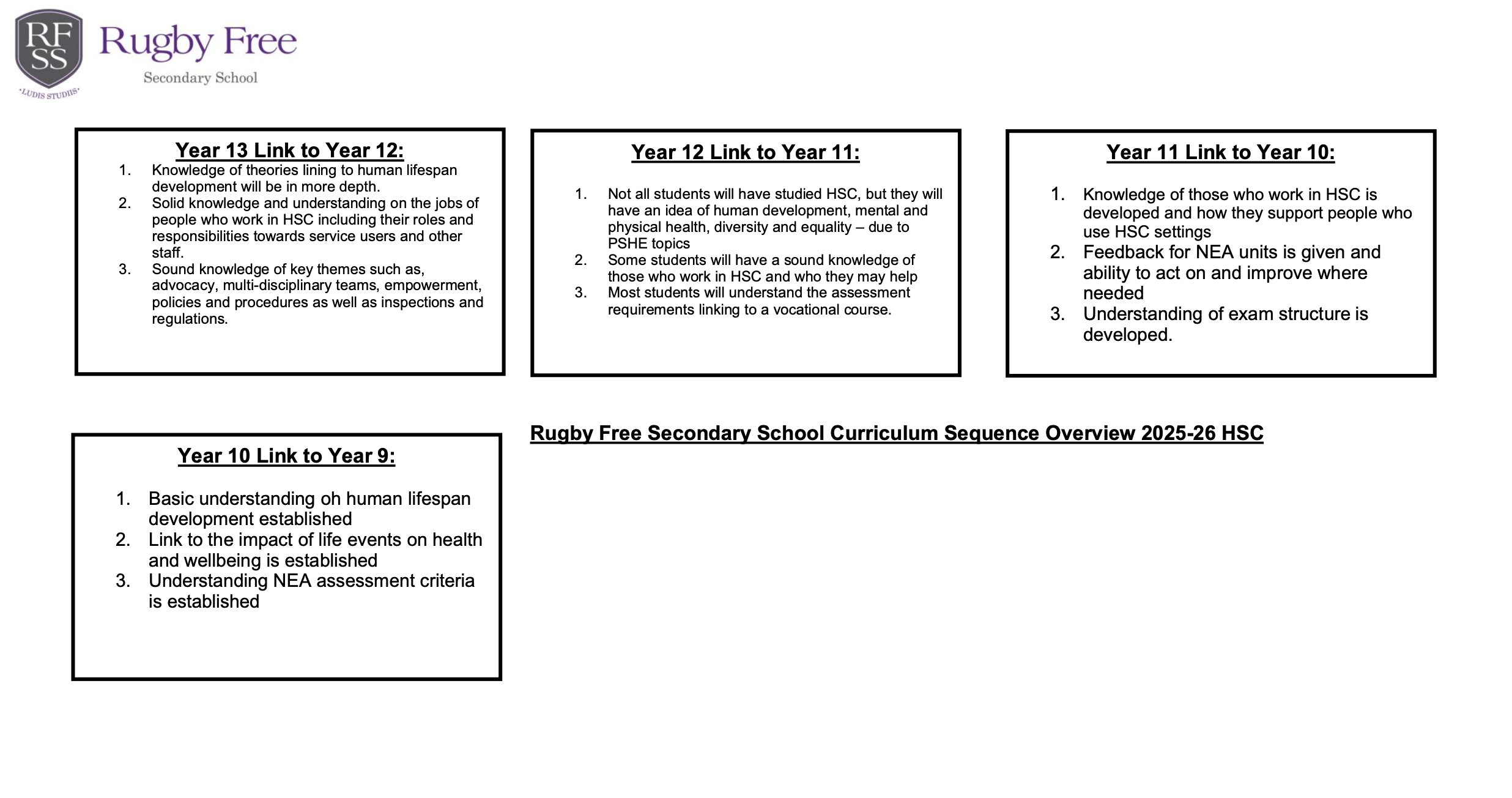 Our Health and Social Care curriculum aims to empower and educate our students in deeper understanding of how we grow and develop as humans and therefore how different factors can impact this, then how these can be influential on our long-term health and happiness. Students learn in detail different supportive measures from interventions, to how to create and establish care plans for individuals, and how to involve multi-disciplinary approaches to a person’s care. Underpinning all of this is their knowledge of the wide range of roles within the Health Care and Social Care sectors will grow over the 3 or 5 years they are studying the subject, learning how the 2 co-exist together and are supported by different agencies. Our curriculum ensures students are shown and taught how to make changes within a person’s life by using real case studies of a diverse range of people to help them develop empathy, compassion, effective communication skills and a reality of the challenges of life people face. Which in return helps them to reflect on their own attributes, building resilience and a deeper understanding of the changes that can be made. Students studying Health and Social Care can aspire to move into careers that support dementia patients, work as nurses and midwives, they can become support workers and carers, amongst learning about the background staff who help the settings to function, meaning that they can aspire to be anyone, whilst developing the knowledge of how to work with a wide range of people and know how to support themselves and those around them throughout their life.