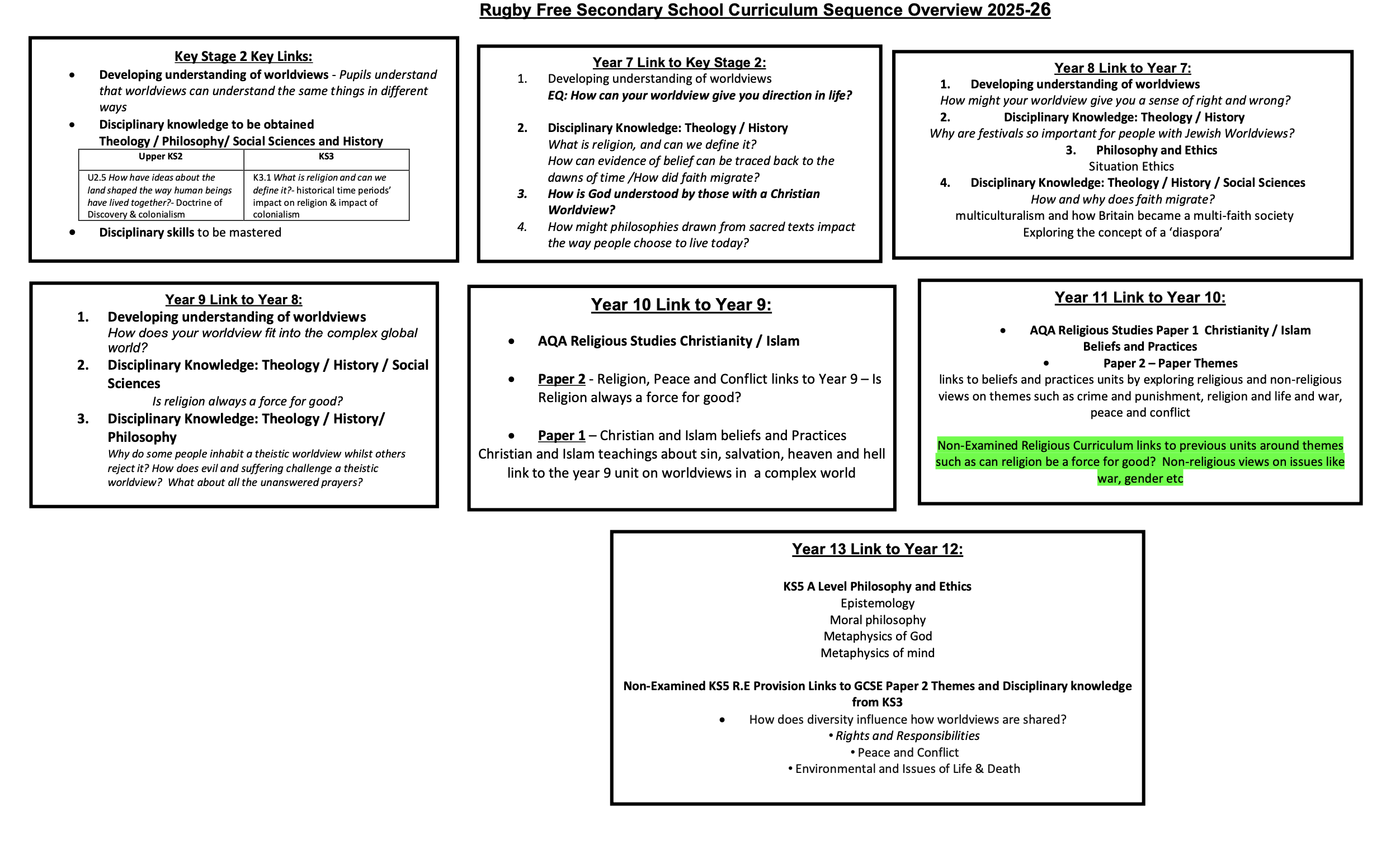 The teaching of R.E is going through a metamorphosis, with a sharper focus on supporting our students in developing their own worldview and in turn understanding the world view of others. Throughout their curriculum journey, we aim to provide opportunities for our students to reflect on the lens through which they view the world around them, allowing our students to explore questions of spirituality, identity, ethics, discrimination and prejudice. We will enable pupils to develop religious literacy and an understanding of what it means to be a person of faith or no faith. We will encourage pupils to engage critically with ideas and experience of religion, belief and spirituality and in turn understand their own personal worldview. Our R.E curriculum endeavours to teach Religious Education not as a survey of world religions but as a “deep dive” into Religion and Worldviews of many kinds. It shifts the emphasis from simply explaining the beliefs and practices of the major world faiths to exploring through academic disciplines the complex picture of religion and non-religion in the 21st century. This necessarily involves every pupil in considering at regular intervals their own personal or worldview.